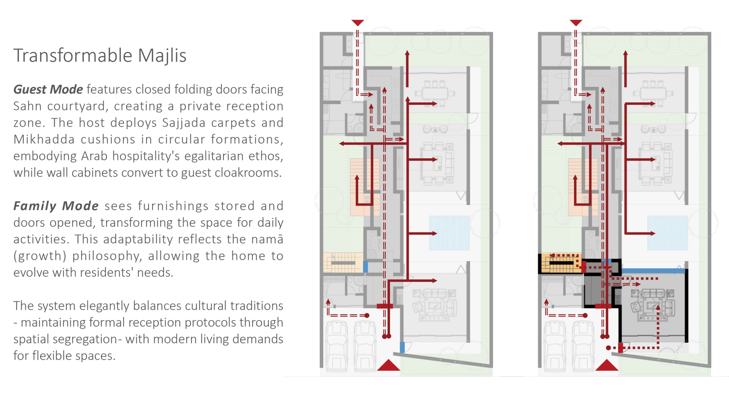 · The Dual-Mode Majlis: We have reinvented the traditional Majlis with a smart, transformable design. It transitions effortlessly from a formal guest reception area (traditional seating) to an open family activity zone.